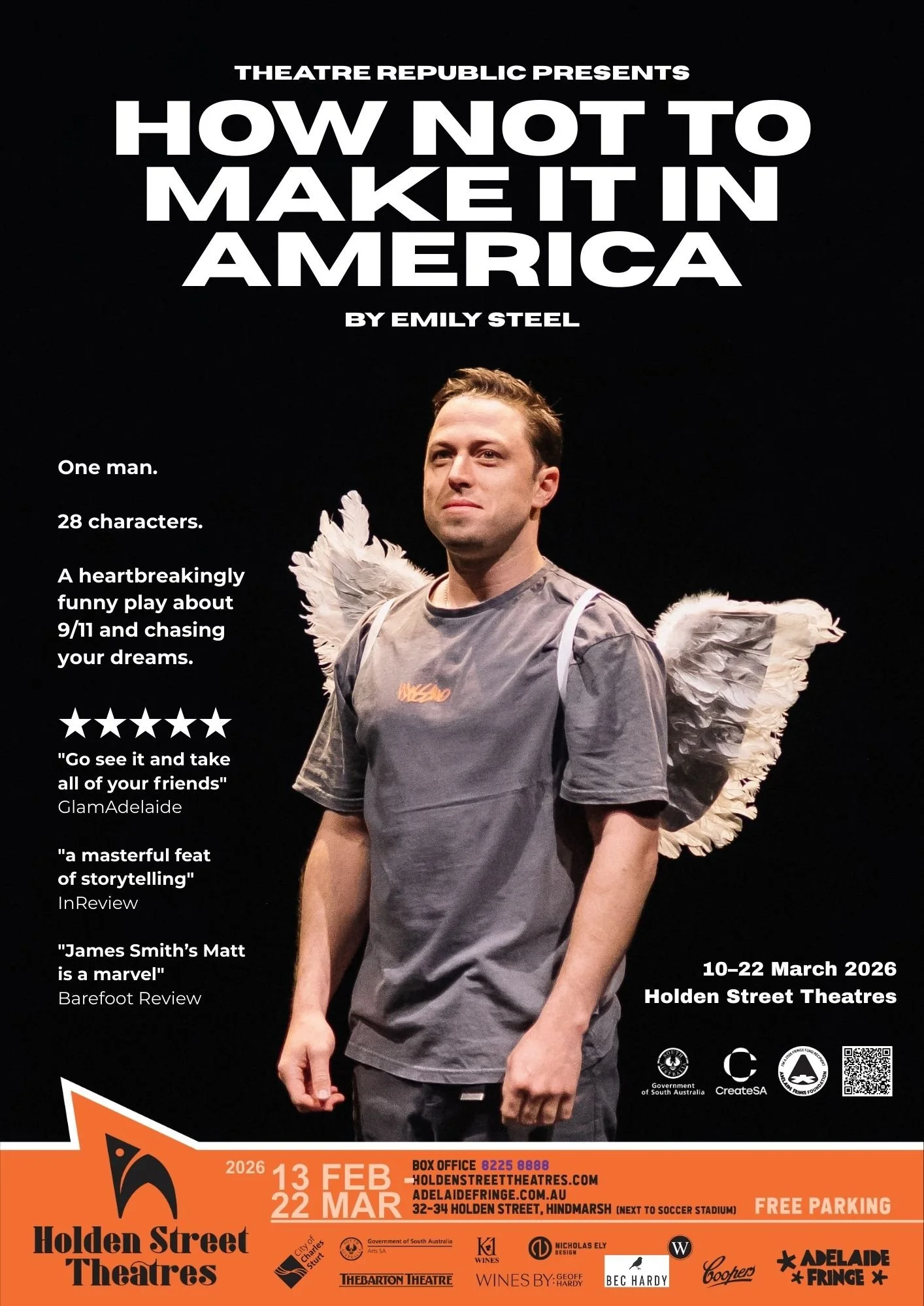 How Not To Make It In America is a funny, moving, one-man show, written by SA playwright Emily Steel, inspired by her real-life experiences in New York on September 11. It’s performed by local actor James Smith, who plays 28 characters to make you laugh, cry, cringe and hope. The original production was presented in the Space Theatre at the Adelaide Festival Centre in 2021, directed by Corey McMahon. The 2026 remount will be directed by Emily Steel.